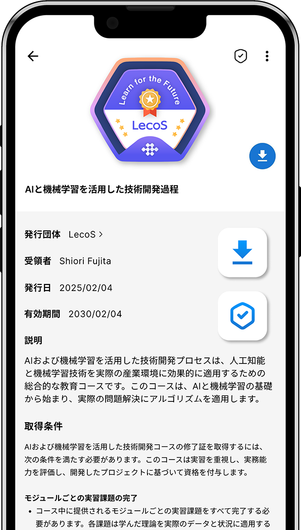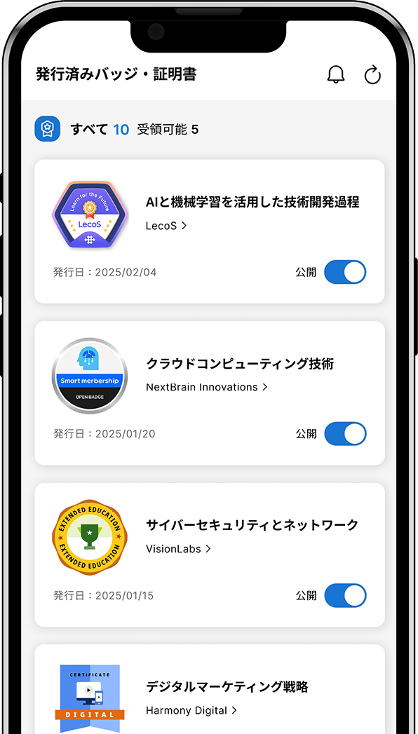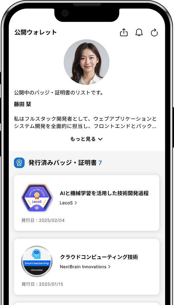 メールやSNS、QRなどで簡単に共有でき、受け取った第三者は、バッジの真正性や内容を検証することが可能です。これにより、企業や教育機関において、スキルの証明手段としての信頼性が高まり、人材採用やキャリアアップの場面で幅広い活用が期待されています。